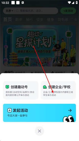 1、打开趣动,在首页点击右上角+发活动。