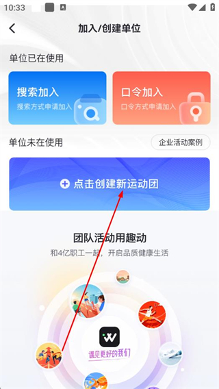 3、进入加入/创建单位页面后,点击点击创建新运动团按钮。