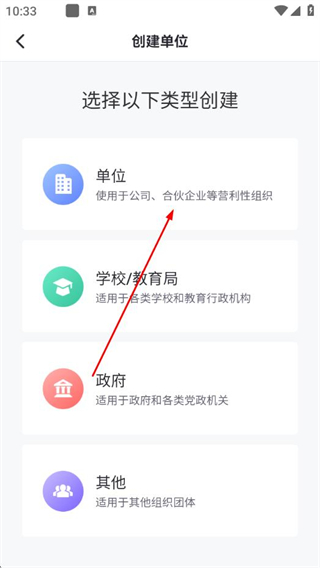 4、在创建单位类型选择页面,选择对应的类型。