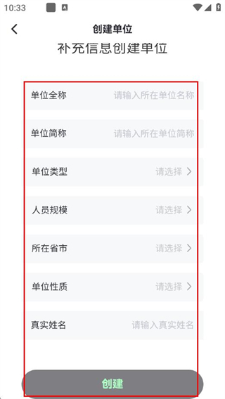 5、在补充信息创建单位页面,填写单位全称、简称等信息后,点击创建。