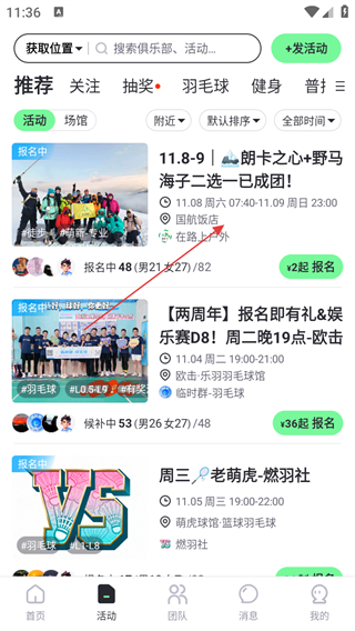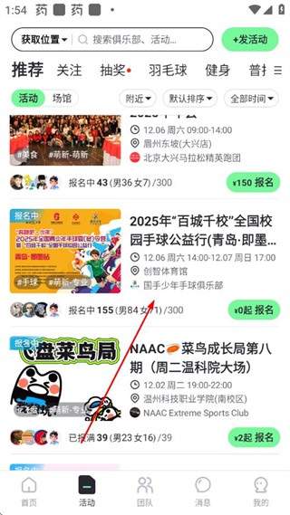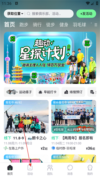 1、打开趣动APP首页,点击底部活动选项,进入活动列表页面。