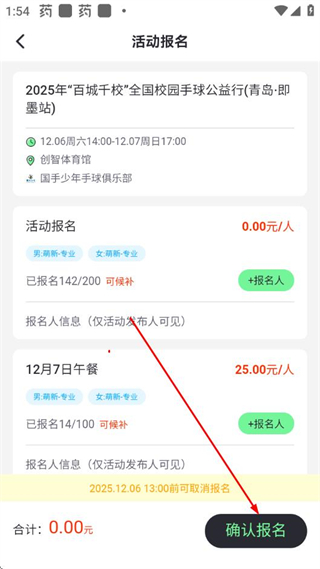 4、在报名页面选择报名项目、添加报名人后,点击确认报名,完成活动参与流程。