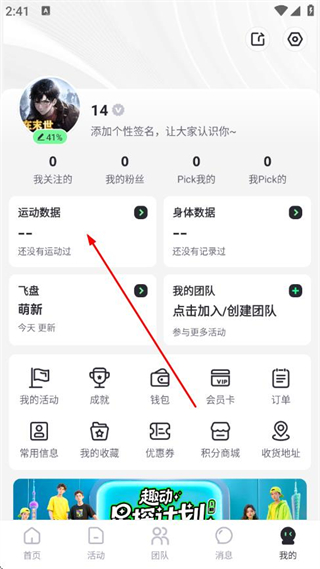 2、在我的页面点击运动数据,进入运动数据页面。