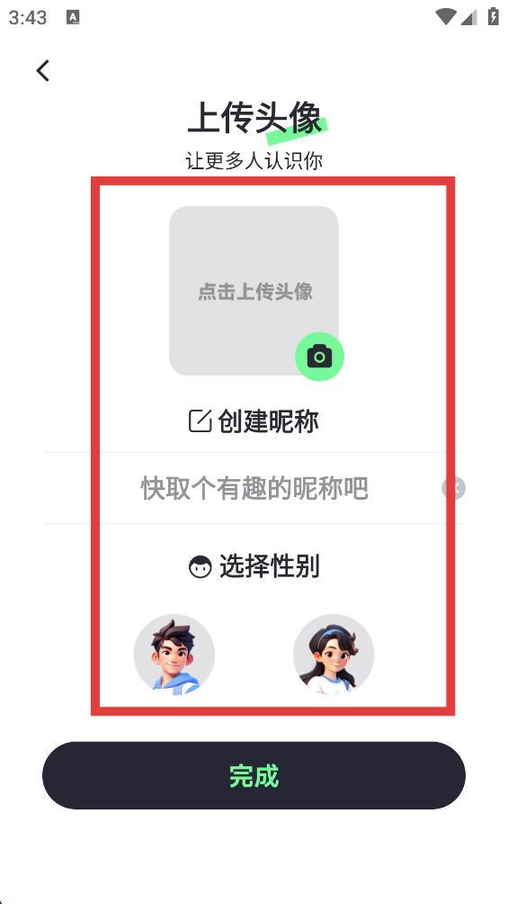 3、在上传头像页面,完成上传头像、创建昵称、选择性别操作后,点击完成。
