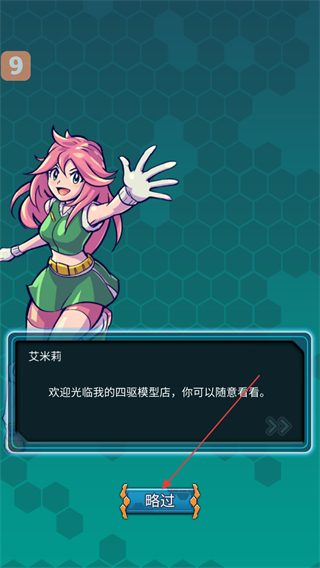 2、在对话界面中,查看艾米莉的欢迎光临我的四驱模型店,你可以随意看看的台词后,点击略过按钮,快速推进这段对话环节。