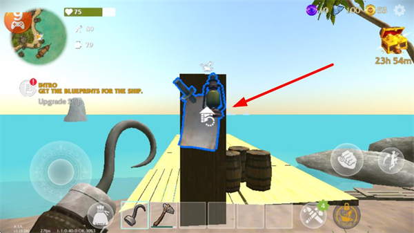 1、在初始场景中找到带蓝色标识的木板,先获取船只图纸,再次点击后可查看船只升级所需资源。
