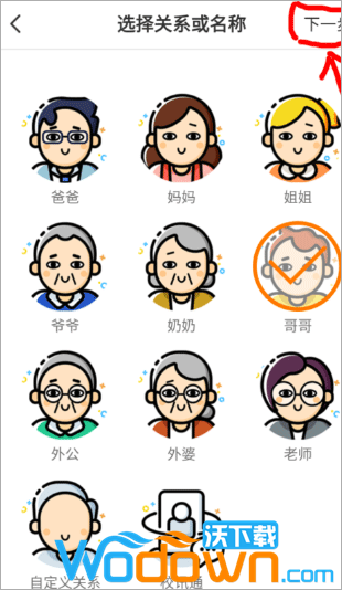 根据要添加的好友选择角色(如“哥哥”),然后点击“下一步”。