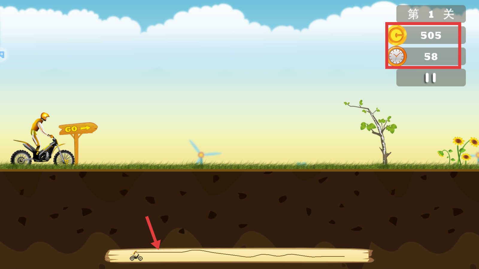 2、进入关卡后,留意右上角【505-金币】与【58-时间】,沿路线前进,把控节奏完成挑战。