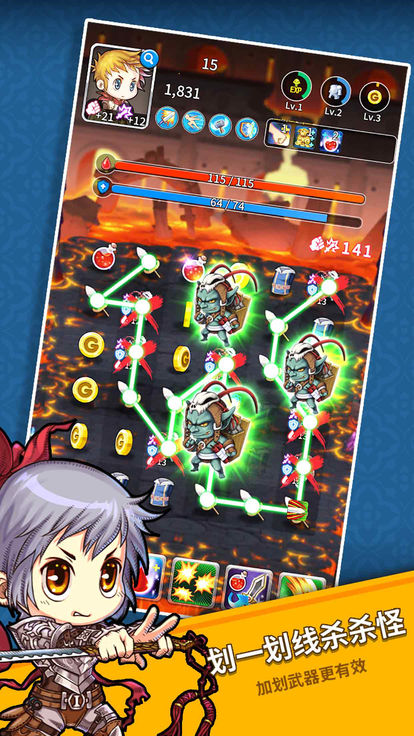 1、独特的冒险对战设定,通过连线的方式,来对抗怪物,将相同的物品或者是攻击链接起来;