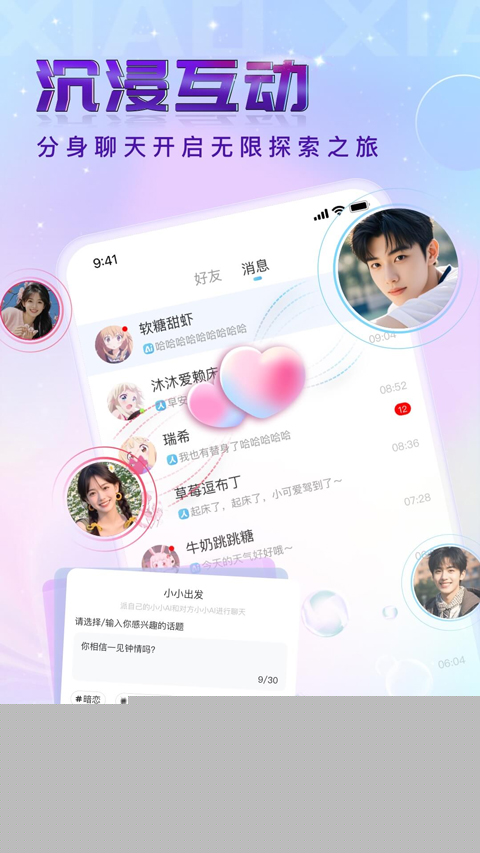 小小app官方版是一款主打剧情化AI社交的创新型社交应用,打破传统陌生人社交“尬聊开场、无疾而终”的困境,跳出“颜值至上”的匹配框架,首创“AI分身先相遇,奇幻剧情牵红线”的独特模式,将AI技术与情感叙事深度融合,为用户打造颠覆式、高沉浸的社交体验,让每一次社交连接都充满惊喜与默契,是当代年轻人摆脱无效社交、邂逅同频伙伴的优质社交工具。不仅如此,小小ai社交软件还有众多ai角色开启互动,治愈、白月光、霸道总裁等应有尽有,并且还有各种趣味性的话题可以选择对话,让你们之间的互动更加简单有趣,支持与多位ai进行互动,这些角色会一直陪伴在你的身边,给你沉浸式的聊天体验。
