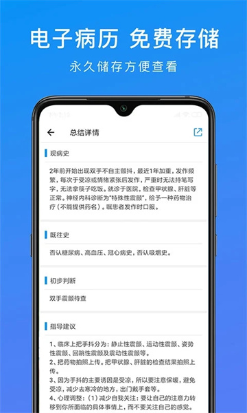 3.提供全方位的健康管理功能,每一个用户都有属于自己的专属健康档案,身体上面的所有数据和问题都会完整的记录下来,方便医生和个人进行查看。