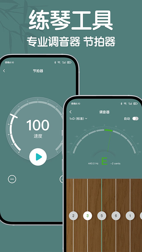 3、内置高精度调音器,通过麦克风识别琴弦振动频率实现快速调音,确保音准;节拍器支持速度调节与复合节奏型,帮助用户掌握稳定节奏,提升演奏专业性。