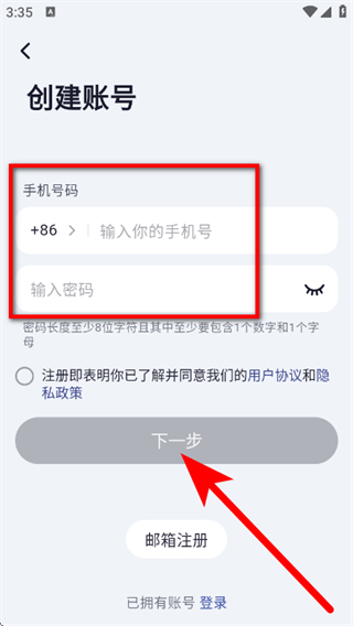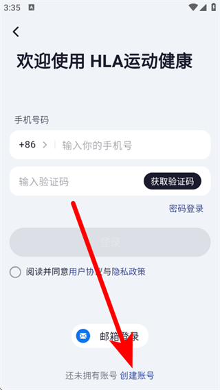 4、在创建账号页面,输入你的手机号,设置密码,勾选注册协议后,获取验证码发送。