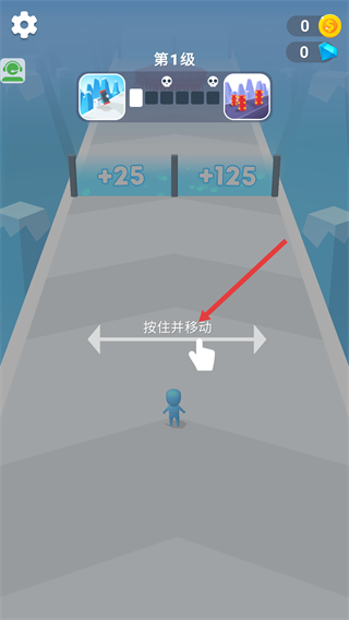 1、处于【第1级】界面时,执行【按住并移动】操作,控制角色触碰【+25】和【+125】区域,积累数值推进关卡。