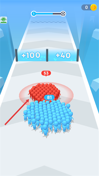 3、遇到敌方群体时,先触碰【+100】区域强化自身,再与敌方对抗,利用数值优势(如【81】对【53】)击败对手。