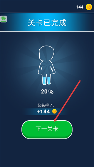 4、关卡完成后,可获得【+144】金币奖励,点击【下一关卡】按钮,进入新的关卡继续挑战。