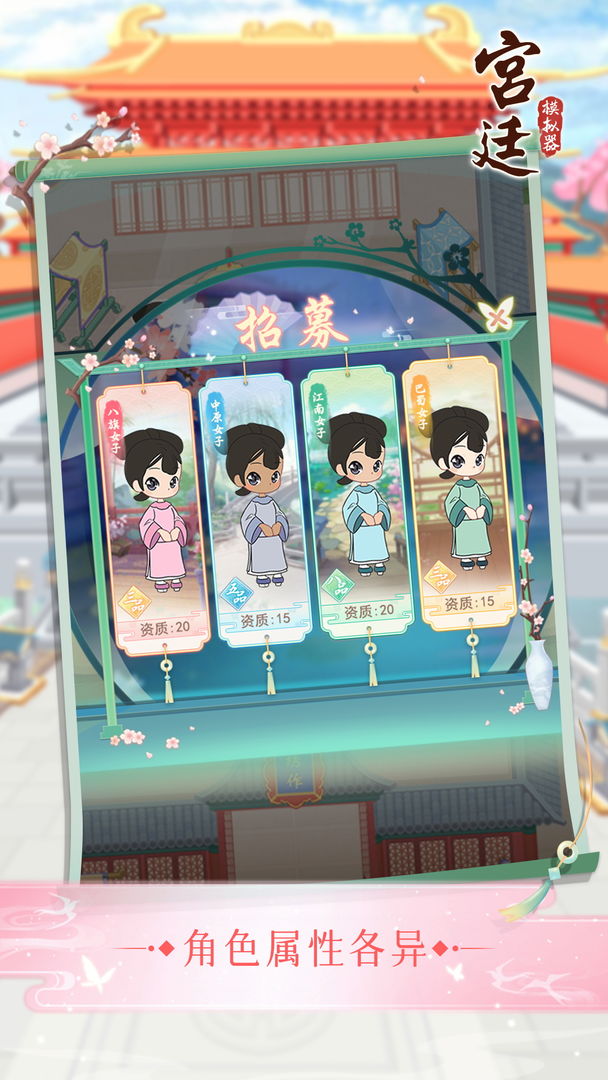 宫廷模拟器是一款古风模拟养成类游戏,在游戏中模拟后宫的勾心斗角,你能够在游戏中看到许多古色古香的建筑,还有充满宫廷元素的服装,玩家在游戏中需要打败所有妃子,成为皇后。