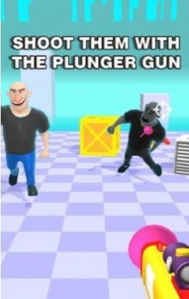 1、点击屏幕即可开启游戏的挑战,灵活操控角色不断瞄准目标位置,然后进行射击,这时候你的柱塞就会产生拉力,最终成功将敌人拉走,击败这些可怕的敌人们!