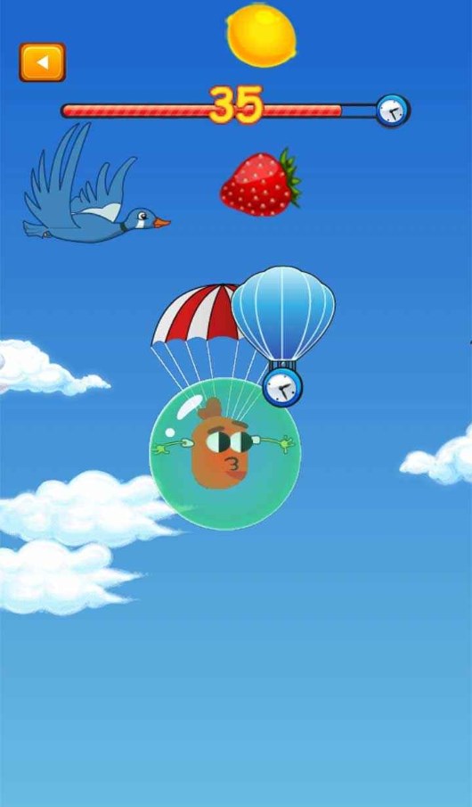 飞行大冒险游戏是一款画风十分可爱的闯关小游戏。故事的主角是一个圆滚滚的小香肠,它并不会飞行儿时依托的降落伞在天空中翱翔,我们在翱翔的过程中要小心避开各种鸟类,因为它们会戳破你的降落伞,同时还要收集各种水果过得分数,当然了还需要收集钟表,这样可以延长我们飞行的时间,非常休闲非常考验玩家敏捷反应的游戏,快来体验试试吧!